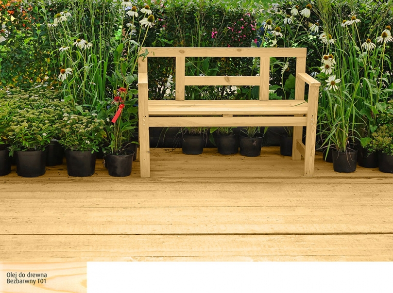 Najważniejszą rzeczą, którą należy zrobić budując taras, to odpowiednie zabezpieczenie desek odpowiednim preparatem. W tym celu pomaluj drewnianą powierzchnię Olejem Do Tarasów Vidaron, który pielęgnuje i chroni drewno przed warunkami atmosferycznymi, ogranicza zabrudzenia i pękanie jego powierzchni oraz zapewnia półmatowe wykończenie podkreślające piękno drewna. Możesz wybrać jeden z pięciu kolorów. My zdecydowaliśmy się na T01 Bezbarwny.